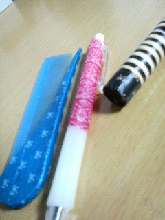 向かって左・百均の櫛。真ん中・105円のボールペン。右・リップクリーム。
